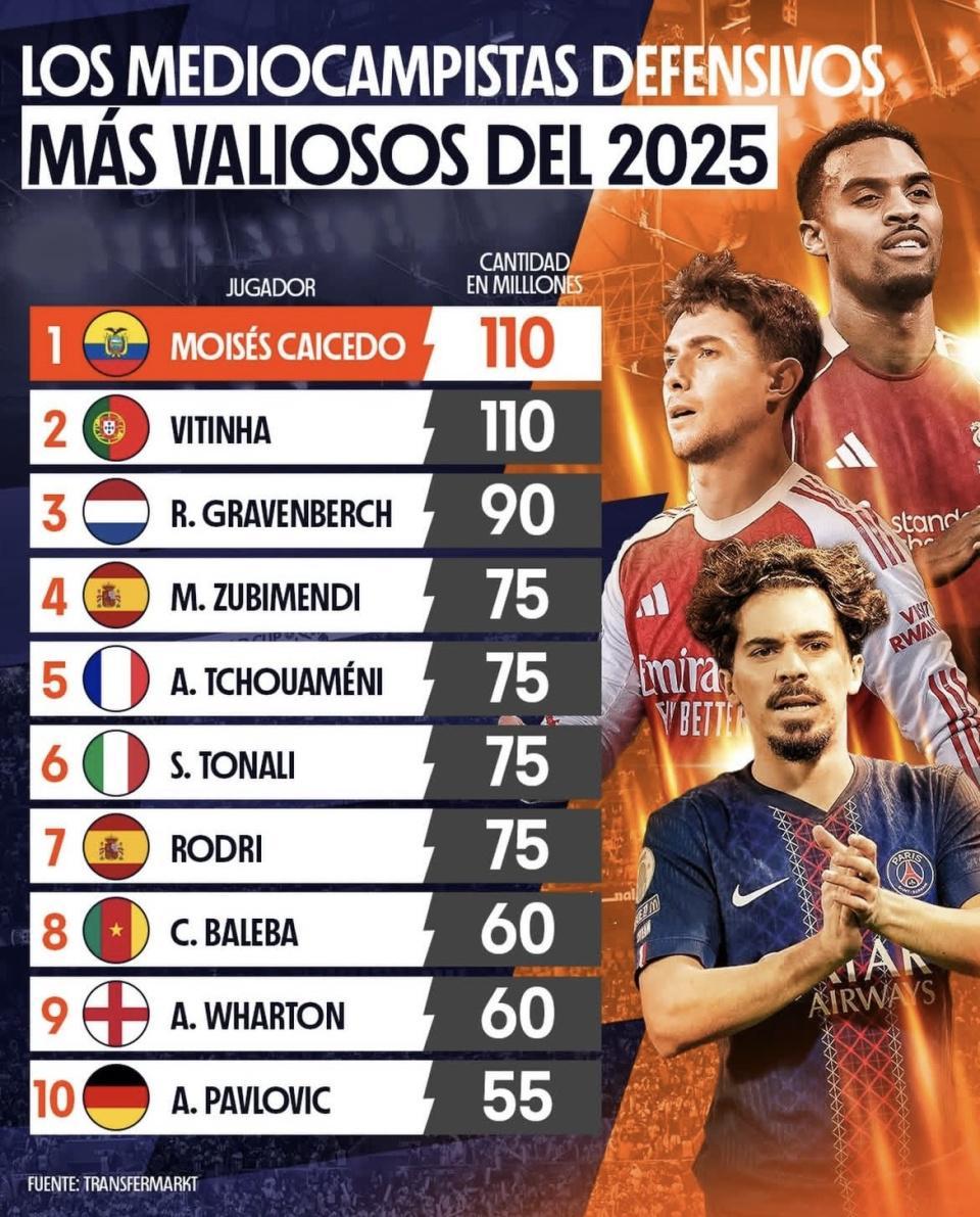 最近德国转会市场发布了“2025年最贵防守型中场”榜单,凯塞多、维蒂尼亚并列1.1亿欧元领跑,格拉芬贝赫紧跟在后。罗德里、琼阿梅尼、托纳利这些大家熟的名字也都在榜上,但赖斯、基米希这种同位置热门反而没进前10。第一名直接顶到1.1亿,你觉得这是纯看即战力,还是把年龄和未来空间也算进去了?下面就按每个人的上场表现和数据,把这份身价排法拆开说清楚。数据截至撰文时间(截至2025年12月31日)。